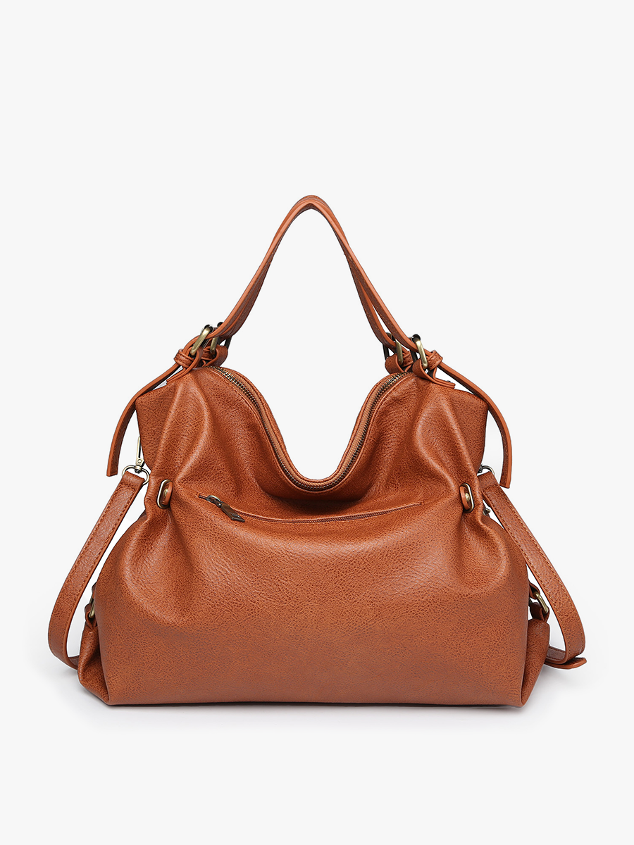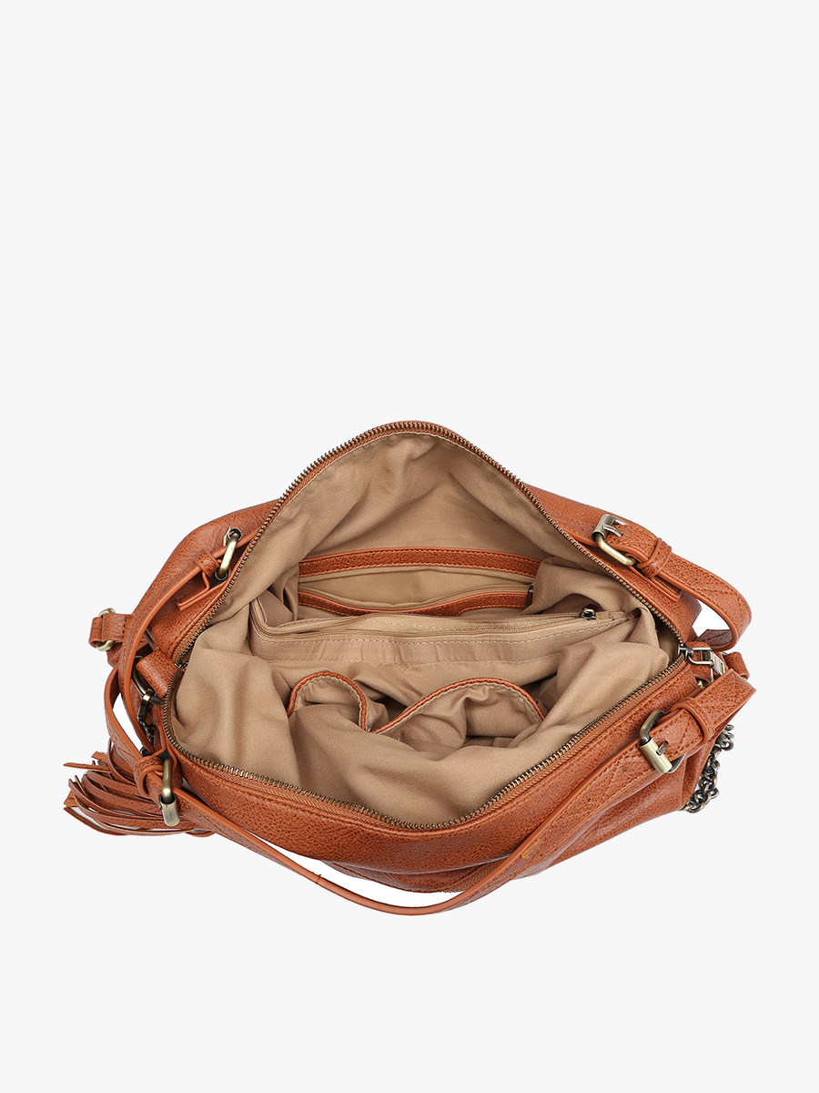 Rustic slouchy tote Handles/Straps: Adjustable handles/straps; Removable chain shoulder strap with whipstitch vegan leather; Adjustable/removable crossbody strap; Closure: Bottom front zip closure with tassel -Interior: Inner zip and slip pockets, inner zip compartment; Pockets: Back zip pocket; Hardware: Gunmetal hardware