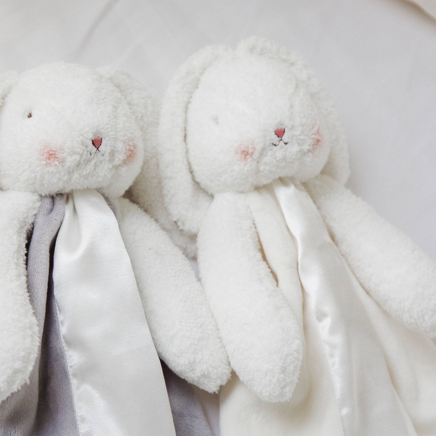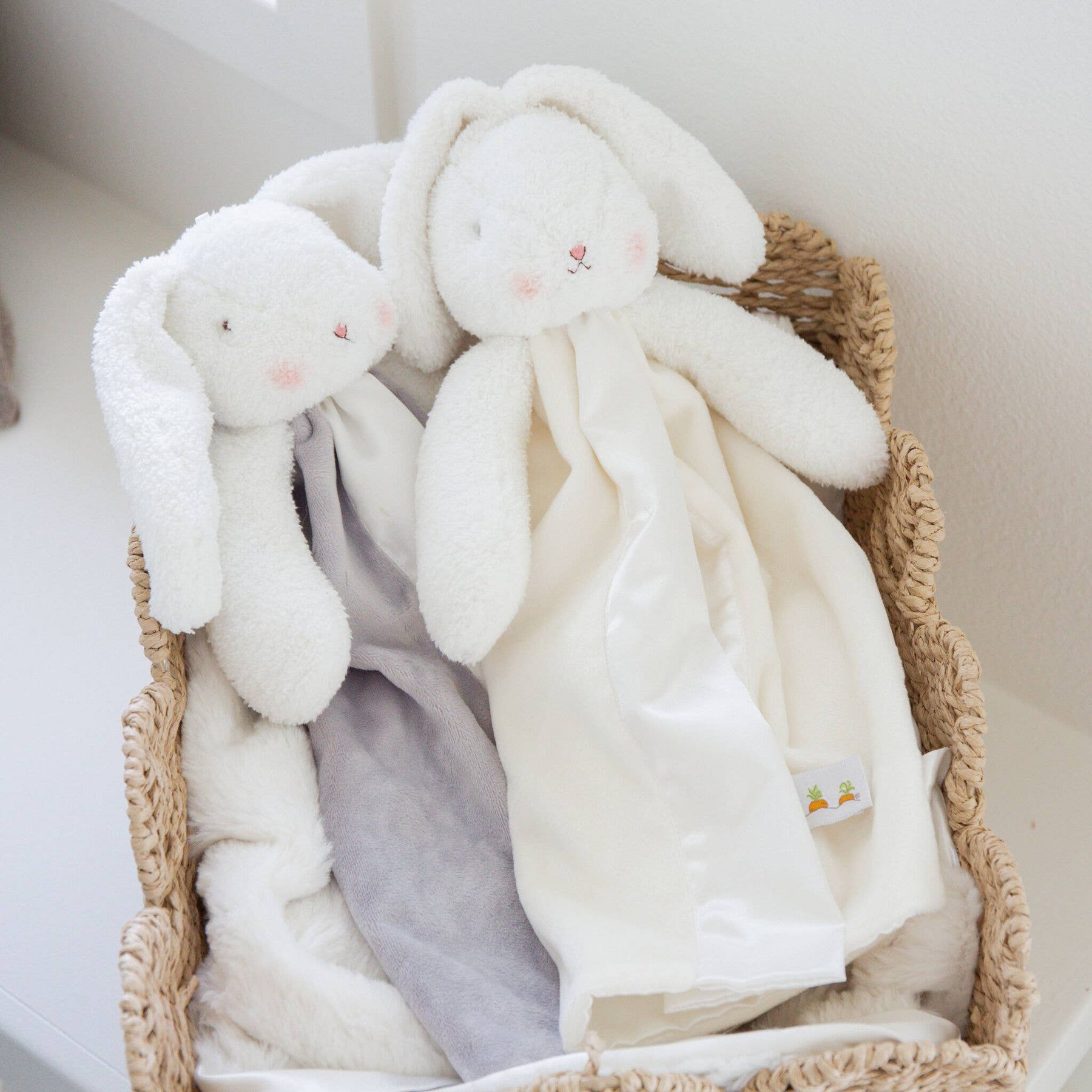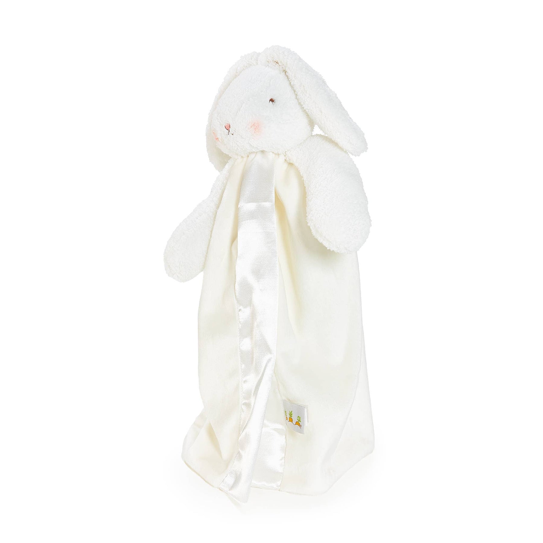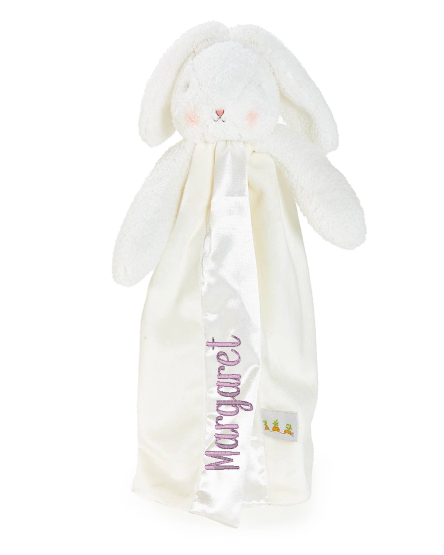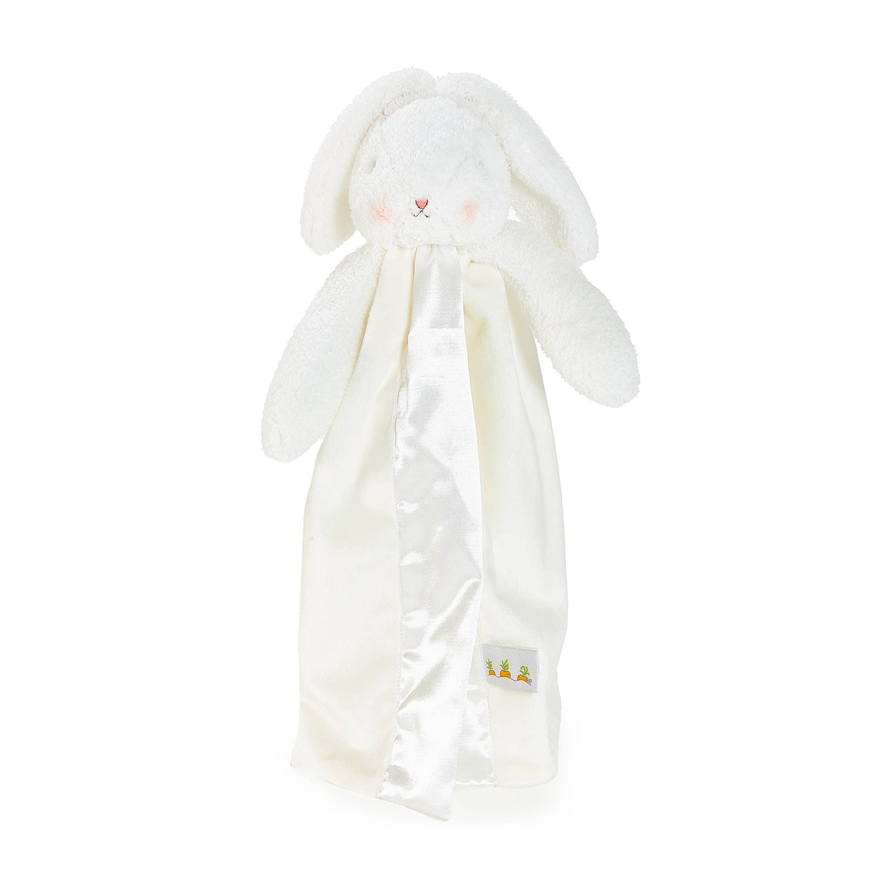 Simple Bun Bun Bunny Buddy Blanket is a soft, cuddly companion for baby. Featuring a plush white bunny head with floppy arms and baby-safe embroidered details, this 16-inch blanket combines a velvety body with silky satin trim for soothing comfort. Made from 100% polyester and machine washable on low heat, it's an easy-care first friend perfect for little hands and sweet dreams.