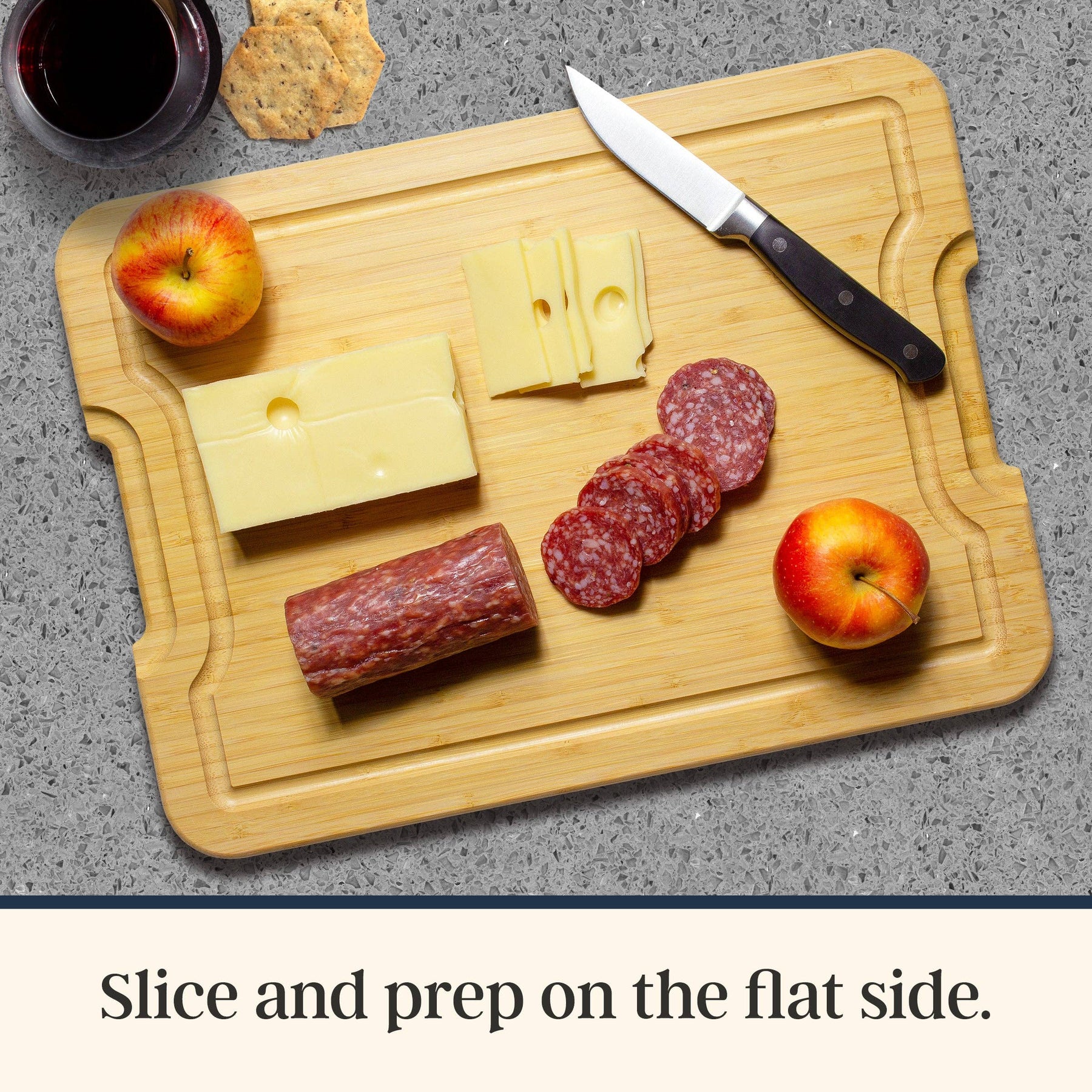 One side features a smooth bamboo cutting board with a juice groove, perfect for prepping meats, fruits, and vegetables. Flip it over to reveal a compartment-style charcuterie board designed for arranging cheeses, cured meats, crackers, fruits, nuts, and sweet treats into a beautiful snack board everyone will love.