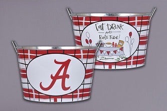 Show your Crimson Tide pride with this festive Alabama-themed metal bucket, perfect for tailgates, game day parties, or spirited home décor. Featuring a bold script “A” on one side and a fun “Eat, Drink, and Roll Tide!” picnic design on the other, this plaid party tub is ready to serve up snacks, drinks, or party favors in true Bama style.