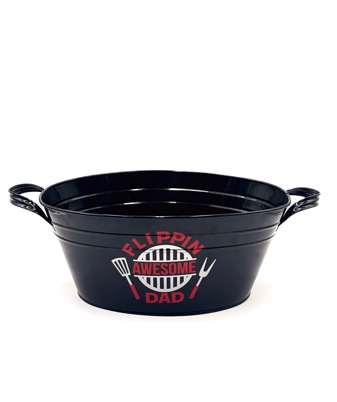 Celebrate the grill master in your life with this bold and fun metal BBQ tub! Featuring the phrase “Flippin’ Awesome Dad” with grill-themed graphics, this black handled tub is perfect for Father’s Day, summer cookouts, or as a gift basket base. Fill it with BBQ tools, snacks, sauces, or cold drinks—it’s a gift that’s as practical as it is playful.